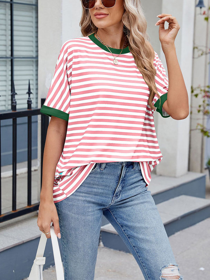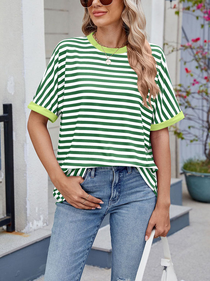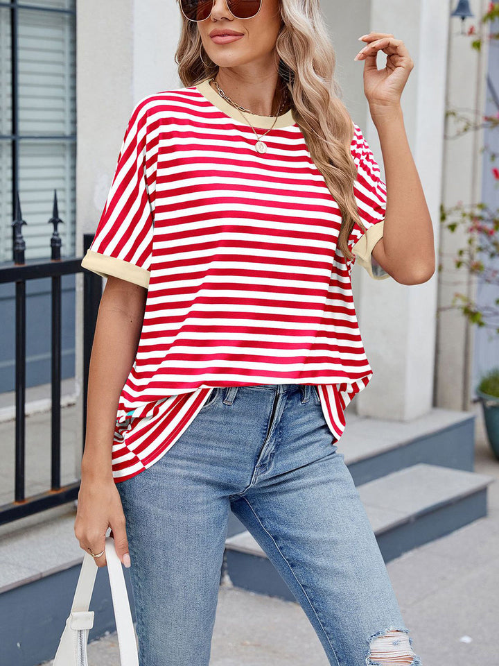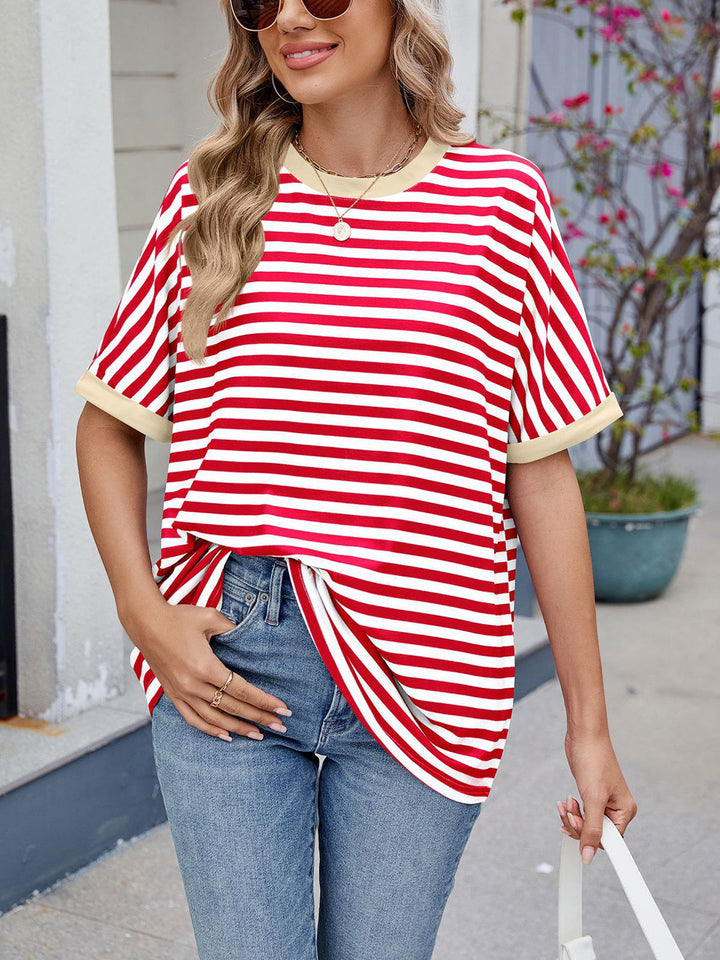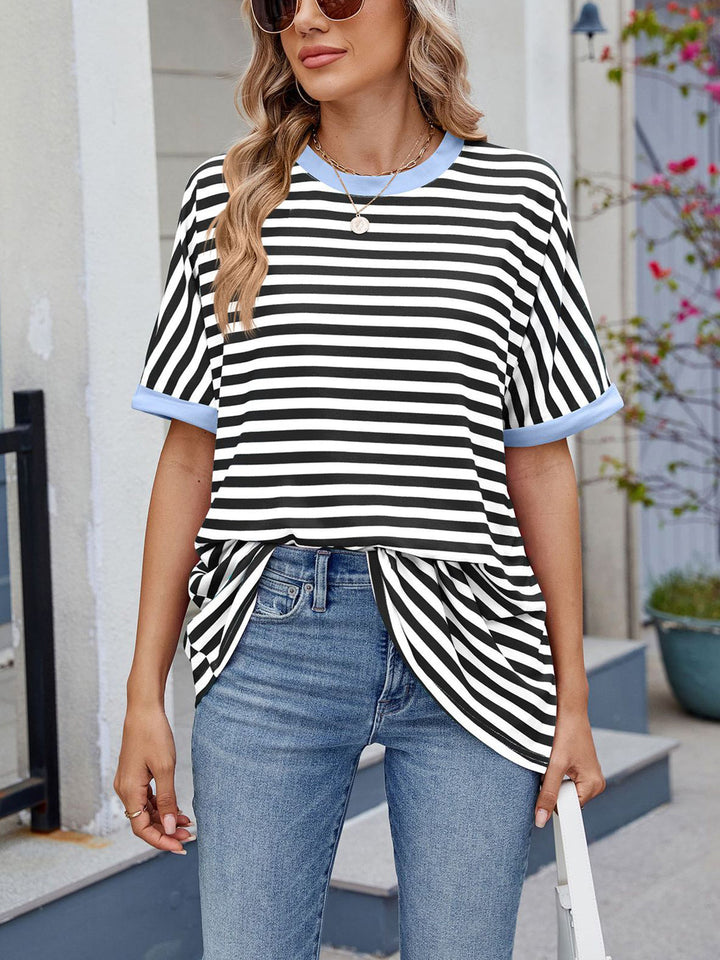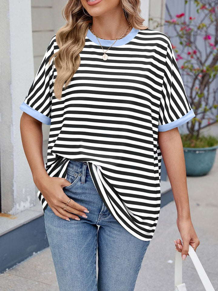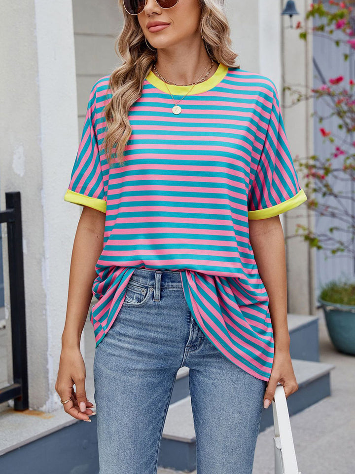 This striped short sleeve T-shirt is crafted from a premium cotton-blend fabric that’s soft, lightweight, and breathable. Stretchy yet structured, it drapes beautifully and feels gentle against the skin—perfect for warm days or layering on cooler evenings.