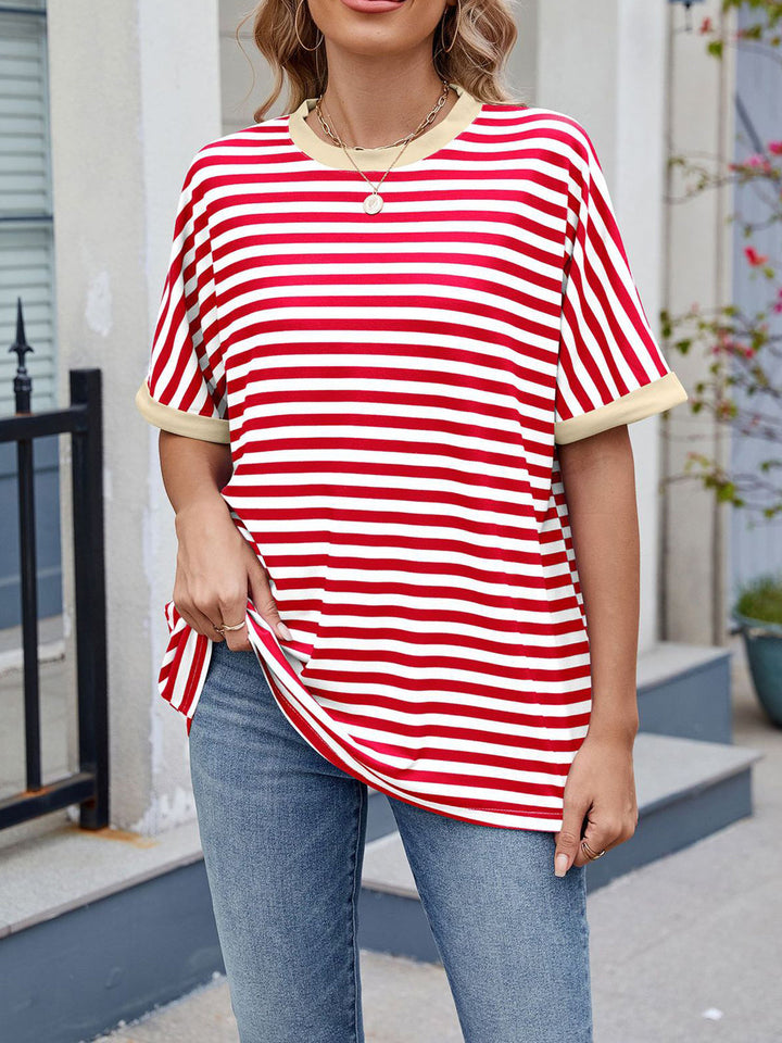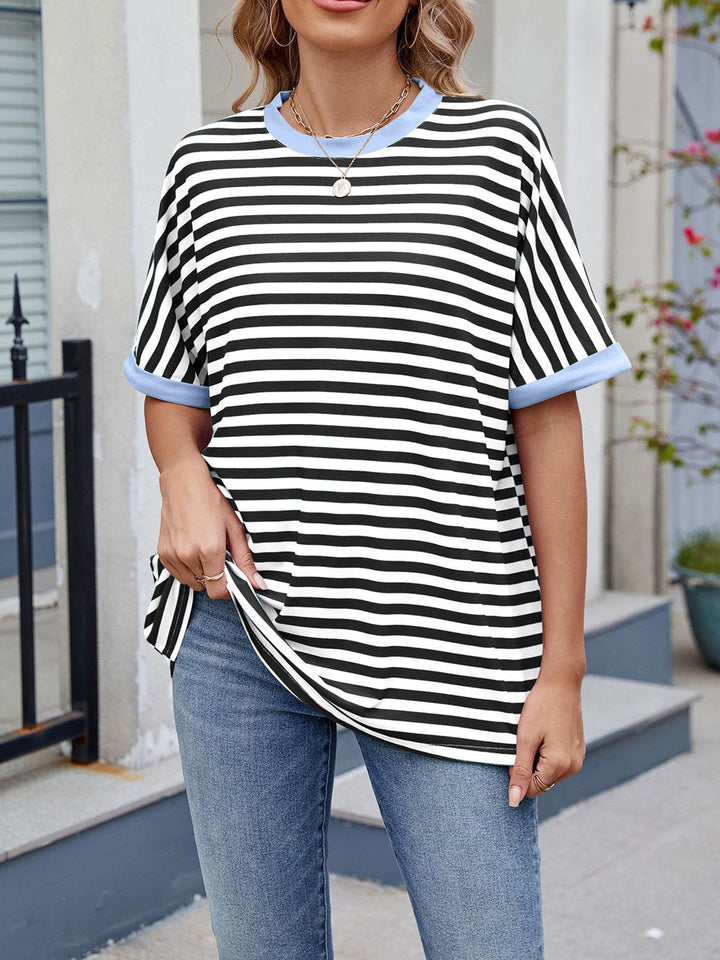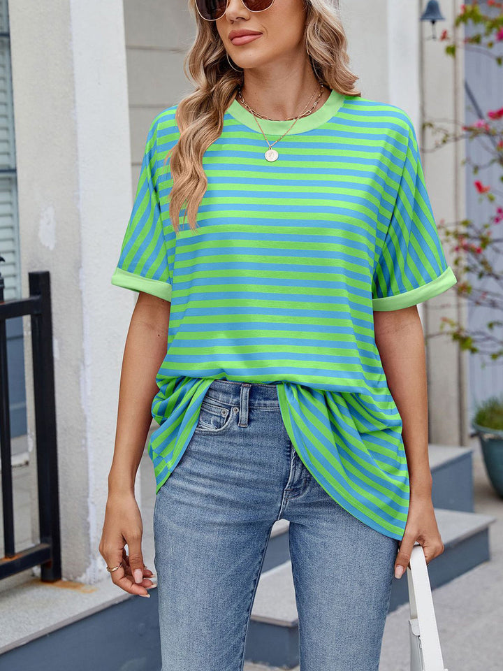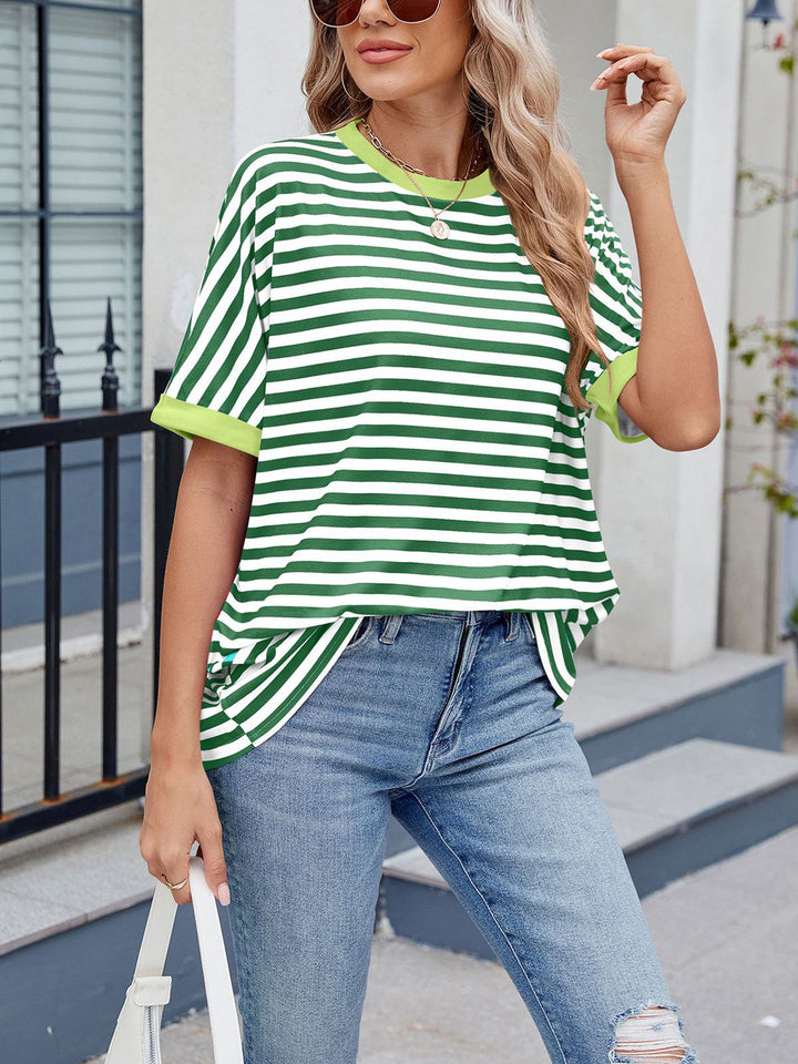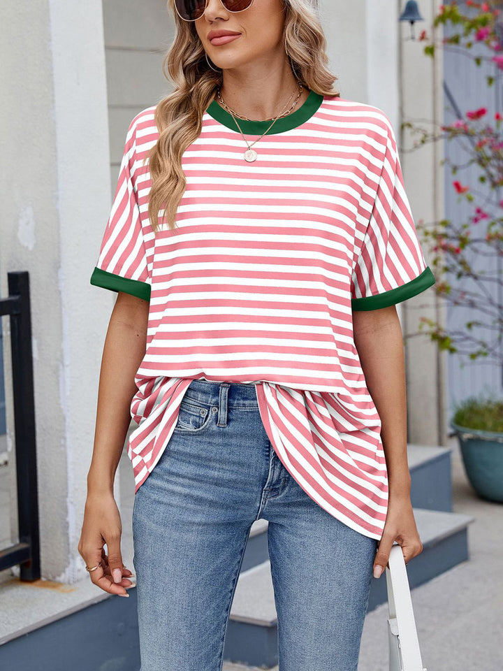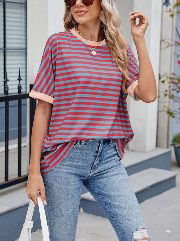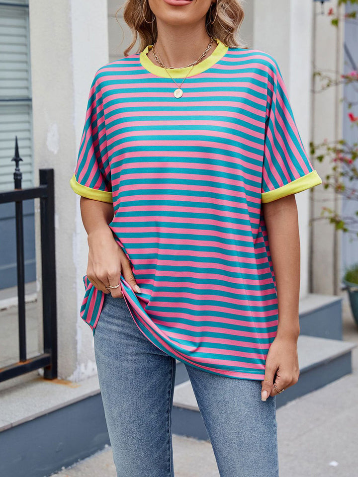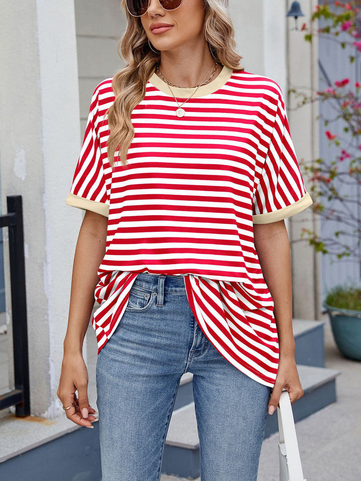 This striped short sleeve T-shirt is crafted from a premium cotton-blend fabric that’s soft, lightweight, and breathable. Stretchy yet structured, it drapes beautifully and feels gentle against the skin—perfect for warm days or layering on cooler evenings.